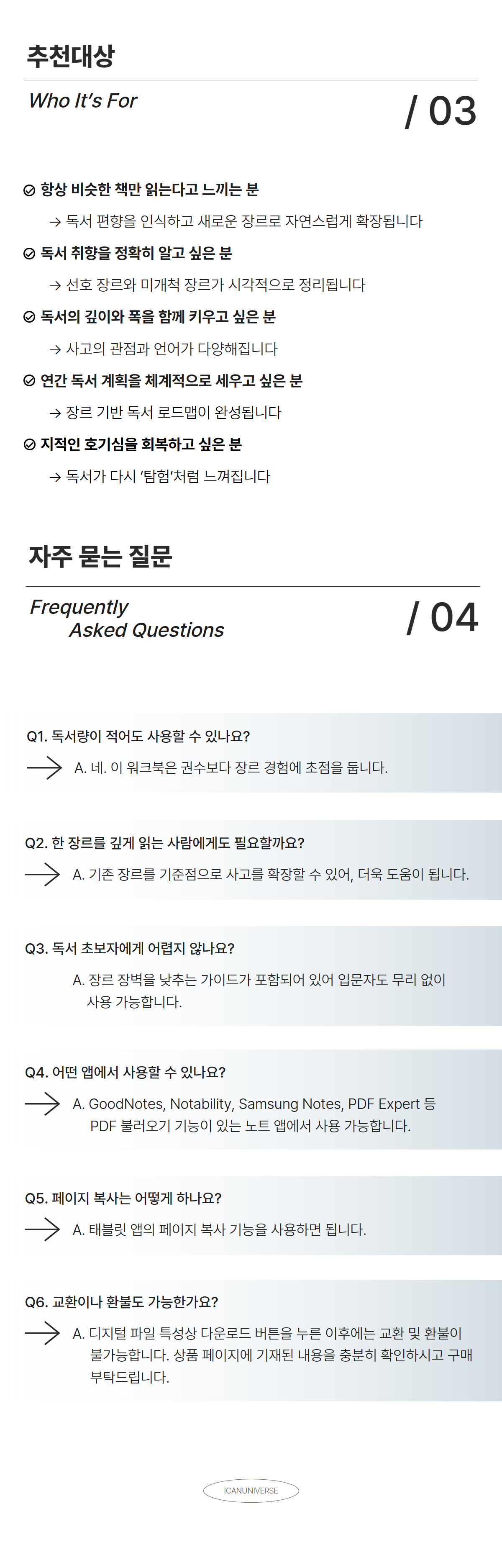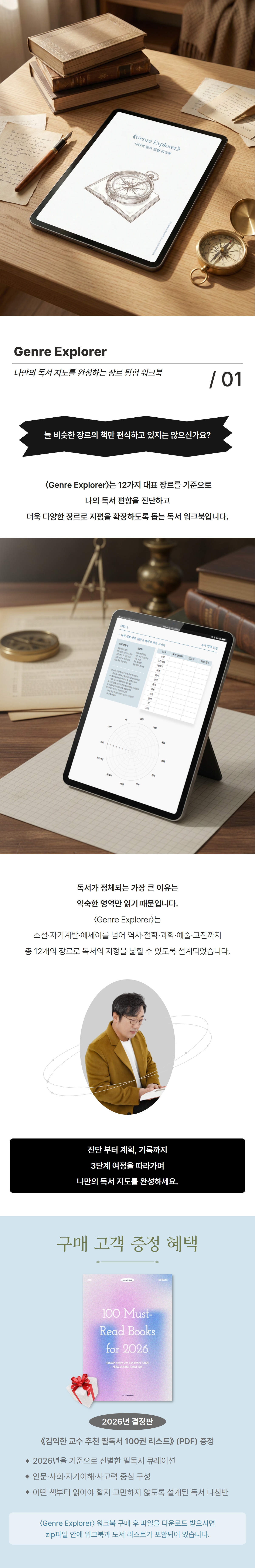 우리는 생각보다 비슷한 책만 반복해서 읽고 있습니다. 〈Genre Explorer〉는 12가지 대표 장르를 기준으로 나의 독서 편향을 진단하고, 읽지 않았던 장르까지 확장하도록 설계된 독서 워크북입니다.